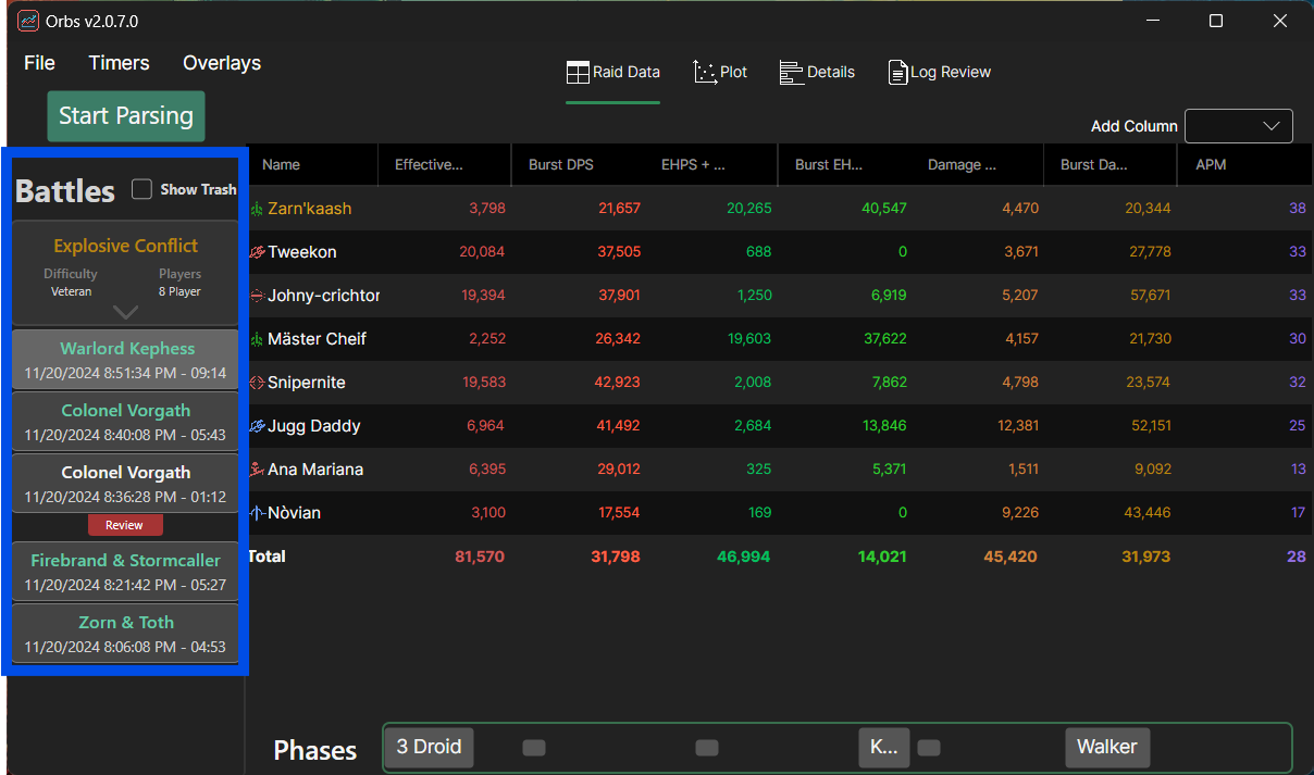 Once combat data is loaded you'll need to know how to navigate the software to see different things. There are two major categories of features in Orbs.