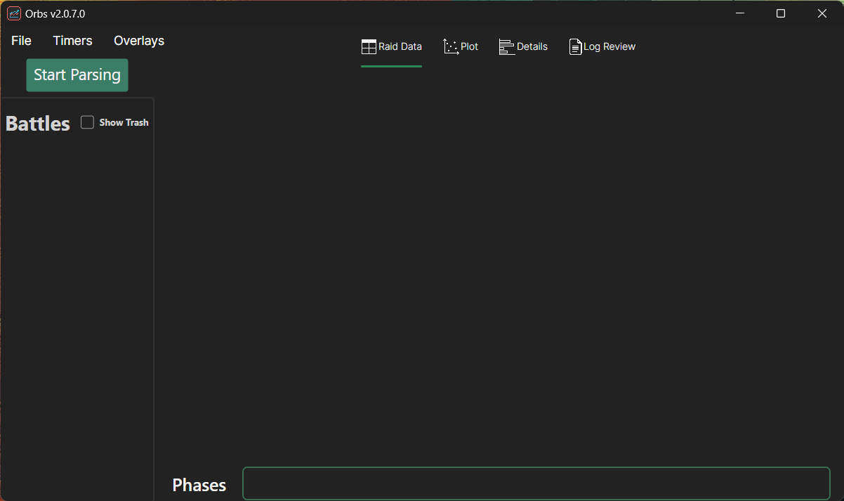 To start live parsing, simply press the green Start Parsing button in the top left. If you already have data in your combat log, it'll process this and then begin monitoring for new information.